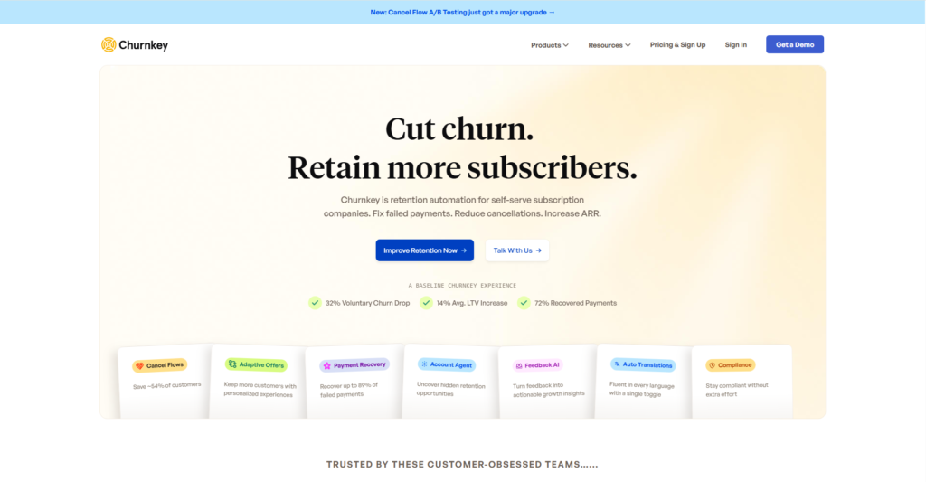 O que faz: Cria fluxos personalizados de cancelamento para empresas SaaS, oferecendo alternativas (pausar conta, mudar de plano, desconto) antes que o cliente cancele de fato.